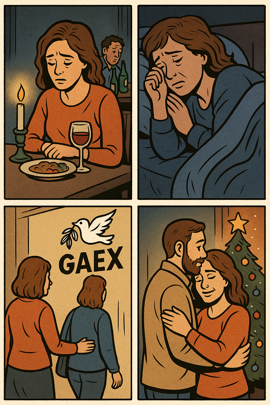 Hola amigos. Soy la mujer de un enfermo alcohólico y os quiero decir la diferencia tan grande que hay de pasar unas Navidades con un alcohólico en activo a pasarlas en abstinencia. Bueno, las que ahora estáis sufriendo ya sabéis lo sumamente malas que son esas fechas. Yo llevo ya 23 maravillosas Navidades, puesto que mi marido va para 24 años que dejó el alcohol. Y ahora sé lo que es vivir, porque antes mi vida era un gran infierno. Porque si a los enfermos alcohólicos, cuando están en activo, se les daña el hígado, el páncreas, etc., a nosotras también hay algo que se nos daña y es el corazón, de tanto sufrir.
